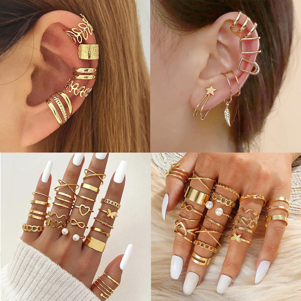 - Stílusos Ékszer Szett Nőknek – Csíptetős Fülbevalók és Rétegezhető Gyűrűk