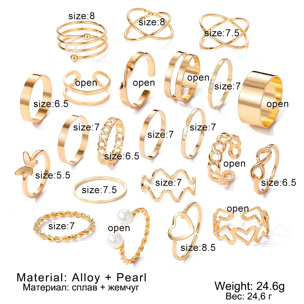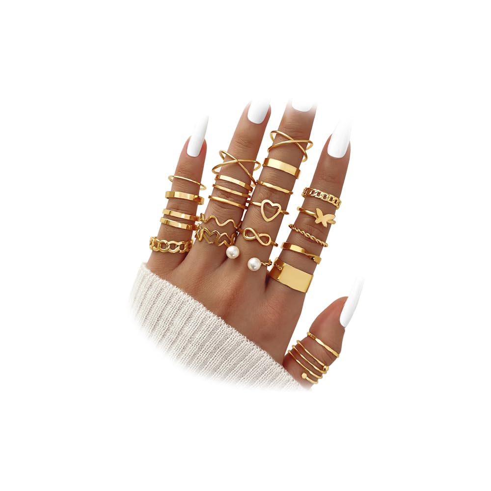 A szett részeként arany színű, különféle mintázatú gyűrűket is találsz: szív, gyöngy, pillangó, lánc és geometrikus formák. Viselheted őket külön-külön vagy egyszerre rétegezve, hogy mindig mást mutass a kezeiden.