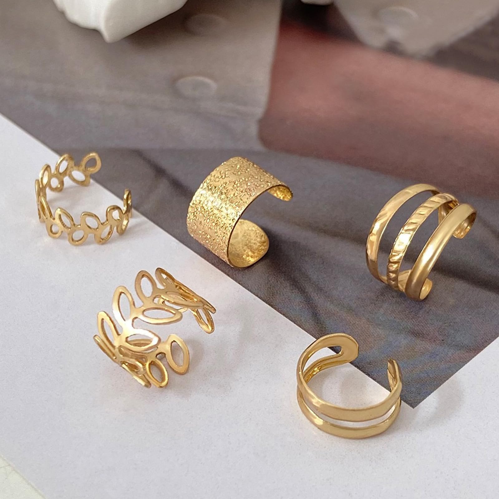 Emeld ki megjelenésed egyedi, mégis elegáns kiegészítőkkel! Ez a trendi ékszerszett arany színű csíptetős fülbevalókból és változatos gyűrűkből áll, amelyek tökéletesen kombinálhatók a mindennapi vagy alkalmi öltözékeddel.