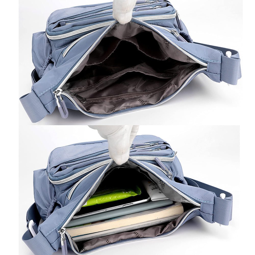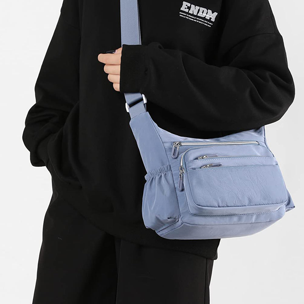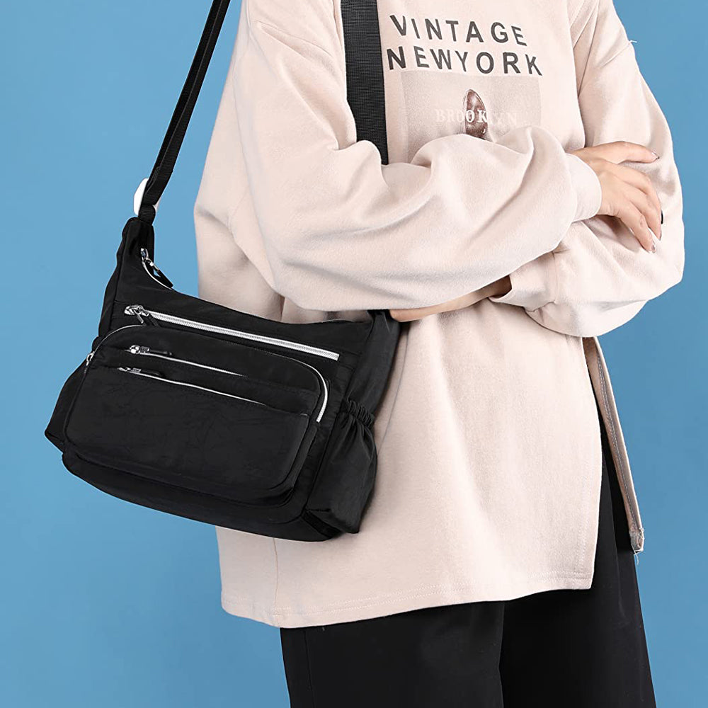 A Dollcini női crossbody hobo táska könnyű, vízálló és rendkívül praktikus választás mindennapi használatra. Prémium nylon anyagból készült, amely strapabíró, foltálló és könnyen tisztítható. Tágas belső tere és több zsebe lehetővé teszi a laptop, pénztárca, telefon és kiegészítők rendszerezett tárolását. Állítható, párnázott vállpántjának köszönhetően kényelmes viseletet biztosít, így ideális munkába, bevásárláshoz, utazáshoz vagy szabadidős programokra is.