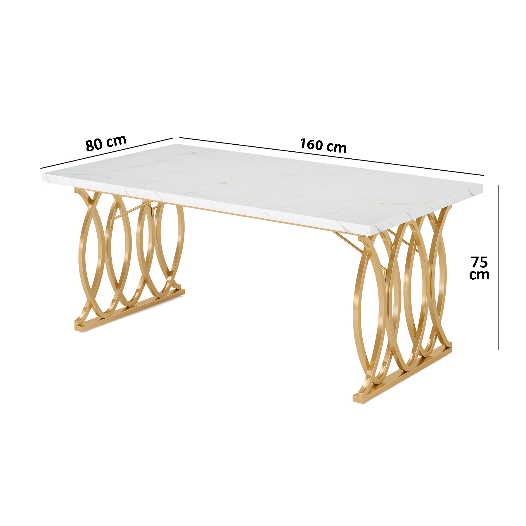 Vigyen kortárs eleganciát otthonába ezzel a lenyűgöző étkezőasztallal! A ragyogó, fehér márvány hatású asztallap és a művészi kialakítású, arany színű fém lábak kombinációja garantáltan az étkezője központi elemévé válik.