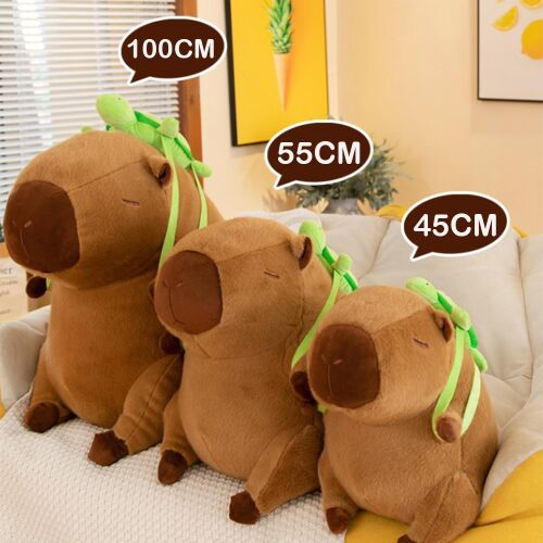 Ez a barna, bohókás kapibara plüss zöld plüssbékával a fején egyedi karakter, amely barátságos megjelenésével és puha textúrájával mindenkit levesz a lábáról.